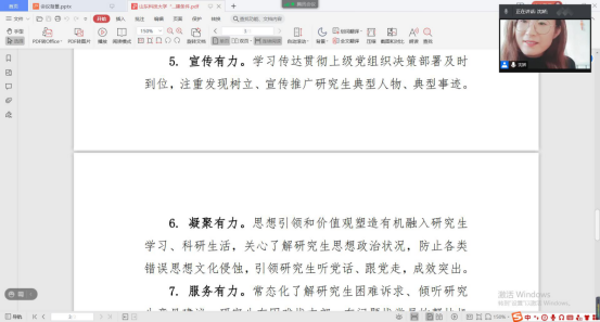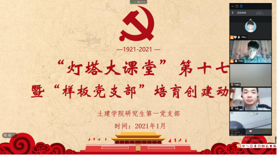 为进一步规范党支部的组织生活,提高支部党员的理论学习水平,深入推进“研究生样板党支部”的培育创建工作,确保党员队伍放假“不掉线”。1月28日下午,利来国际研究生第一党支部通过腾讯会议线上召开支部大会,集中组织学习了“灯塔大课堂”第十七讲,并就“研究生样板党支部”的创建工作作了动员,研究生第一党支部全体党员、学工办老师沈娇及部分入党积极分子代表参与了本次会议,会议由党支部书记韩一鸣主持。