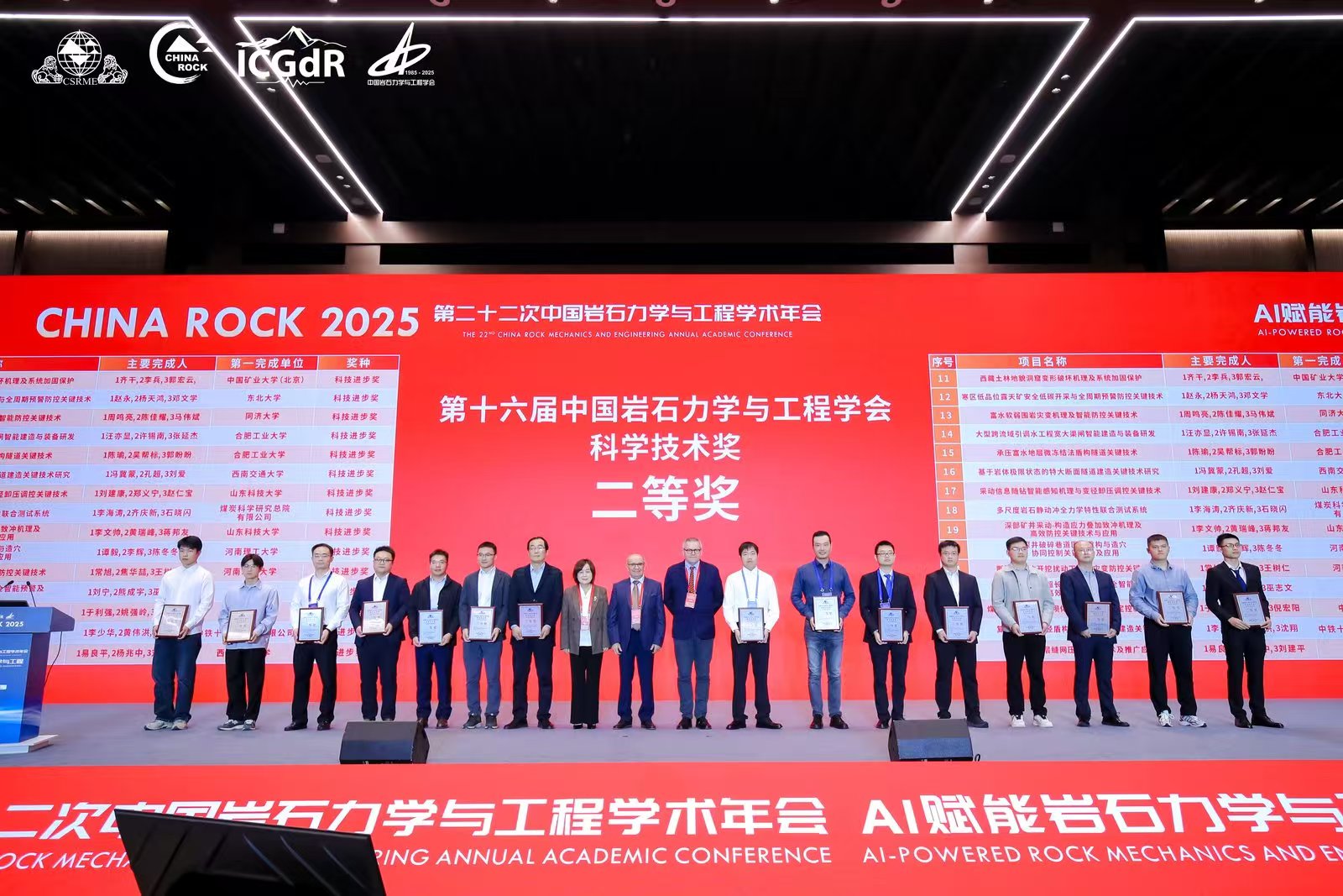 10月18日,CHINAROCK2025第二十二次中国岩石力学与工程学术年会在河北雄安隆重召开。会议期间,中国岩石力学与工程学会举行了2025年科学技术奖颁奖仪式,公司作为第一完成单位,公司李文帅教师主持完成的“深部矿井采动-构造应力叠加致冲机理及高效防控关键技术与应用”项目获科技进步二等奖、黄娜老师作为主要完成人完成的“岩质隧道地震动灾变理论及吸能减震设计方法”项目获自然科学二等奖。