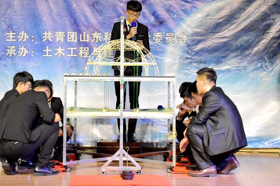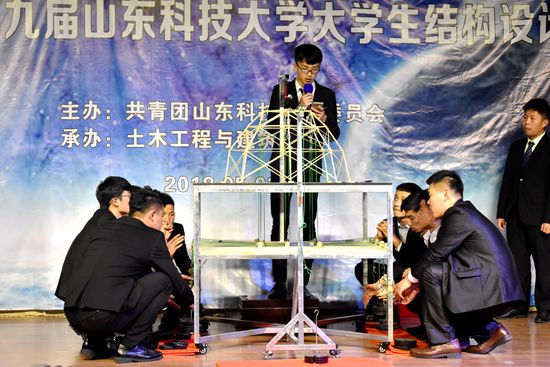 据悉,预赛由四十二支队伍参加,十一支队伍在冲破重重障碍后站到了决赛的舞台上。紧张而激烈的比赛在一段介绍参赛模型背后故事的视频后拉开序幕。首先是模型展示与模型介绍,模型介绍要求每支团队结合PPT进行2分钟的讲解,随后是评委提问。最激动人心的属结构加载环节,每一支队伍都选择不同的加载重量,加载时分为一级荷载、二级荷载和三级荷载。有些队伍在一级荷载时就遗憾失败,而个别队伍坚持到了三级荷载,成功完成了挑战。在决赛的舞台上每一个结构模型都给我们展示不同寻常的力量,观众们随着加载重量的增加而紧张,随着模型的坍塌而感到惋惜,当参赛队伍的模型成功完成了三级荷载时同学们由心地发出赞叹。在十一组模型比拼结束之后,王崇革副经理对本次活动做了最后的点评,他说道:此次比赛让我看到同学们的辛勤付出,十一个模型做得各有千秋。同学们能充分运用所学知识,这让我感到骄傲和自豪!