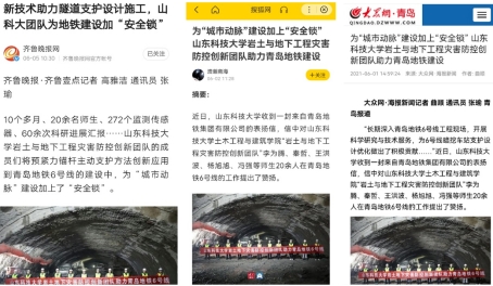 近日,利来w66收到一封来自青岛地铁集团有限公司的表扬信,信中对利来国际“岩土与地下工程灾害防控创新团队”师生20余人在青岛地铁6号线的工作提出了赞扬。近日,该团队事迹材料先后被山东科大报、大众网、搜狐网等多家媒体宣传报道,《新技术助力隧道支护设计施工,山科大团队为地铁建设加“安全锁”》被齐鲁晚报、半岛壹点报、山东热搜等多家媒体宣传报道。