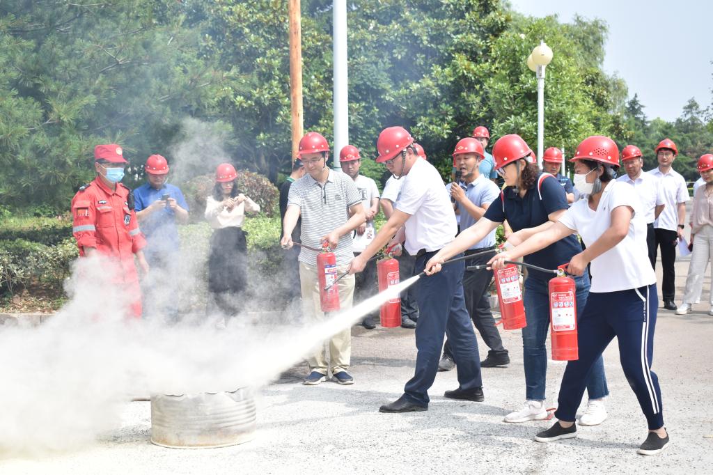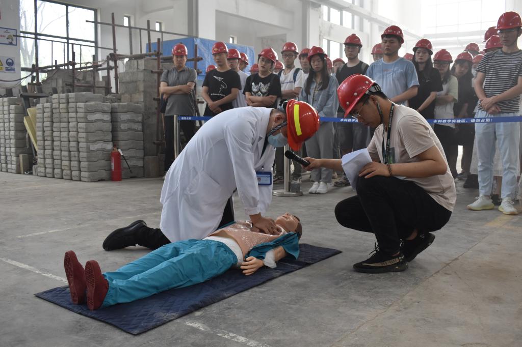 演练现场,校医院副经理李辉为师生介绍并演示了对伤员的抢救步骤,安全管理处消防人员演示了灭火器的使用步骤并指导部分同学进行实操学习。