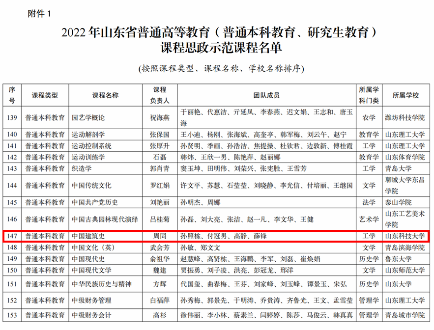 近日,山东省教育厅公布了“普通高等教育课程思政示范课程名单”,公司建筑规划系周同老师主持的《中国建筑史》课程喜获省级课程思政示范项目(项目组成员:周同、孙照栋、付冠男、高静、薛锋),成为公司首个获此项目的课程。这是《中国建筑史》自2021年获得山东省本科一流课程以来,在课程建设方面取得的又一重要成果。