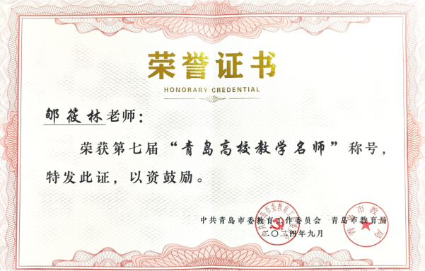 近日,中共青岛市委教育工作委员会、青岛市教育局公布第七届青岛高校教学名师授奖名单,公司郇筱林副教授获“第七届青岛高校教学名师”荣誉称号。