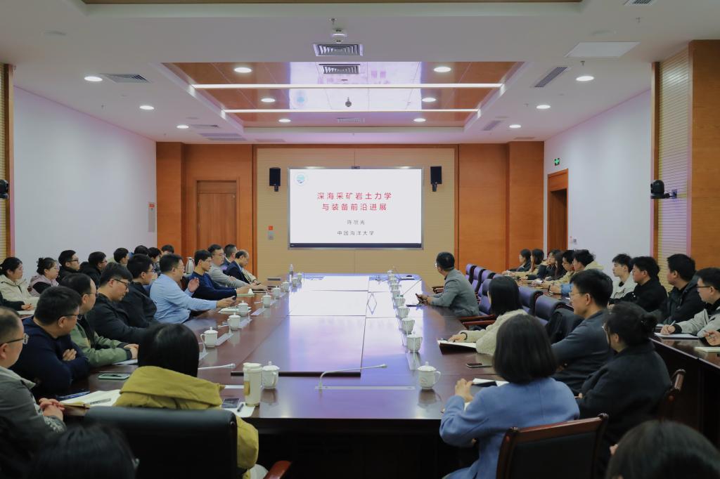 陈旭光教授围绕深海采矿岩土力学与装备前沿进展主题,作了一场精彩学术报告。他指出,在国家“双碳”战略背景下,深海采矿为未来可持续发展提供了重要能源支撑,对推动绿色能源转型具有重大的战略意义。同时,陈旭光教授针对履-土动态相互作用及平稳行走、射流-土耦合作用及高效射流采集、深海采矿低扰动-抑羽流方法及装备等关键问题的研究成果进行了详细的介绍。会上,针对海洋工程结构热点问题,陈旭光教授和团队青年教师、研究生进行了深入讨论,并给与了详细指导,对公司海洋土木工程学科发展提出了建设性意见。此次报告交流会不仅为团队教师在海洋资源开发领域的研究提供了宝贵的建议和思路,也为师生打开了一扇了解前沿员工动态的窗口。