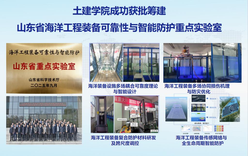 山东省海洋工程装备可靠性与智能防护重点实验室由山东省土木工程防灾减灾重点实验室整合组建,联合山东大学和山东能源集团新能源集团有限公司,通过学科交叉与资源优化,形成了以“海洋工程装备可靠性与智能防护”为特色、聚焦国家与省重大战略需求的研究应用型科研平台。实验室将围绕海洋装备设施多场耦合可靠度理论与智能设计、海洋工程装备多场协同损伤机理与防灾优化、复合防护材料研发及跨尺度调控、传感网络与全生命周期智能防护等四大方向开展攻关,着力突破一批“卡脖子”技术难题,为山东省海洋强省建设和国家海洋经济高质量发展提供关键技术支撑和人才保障。