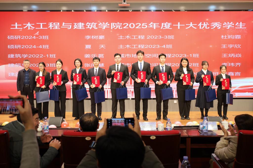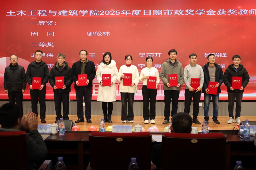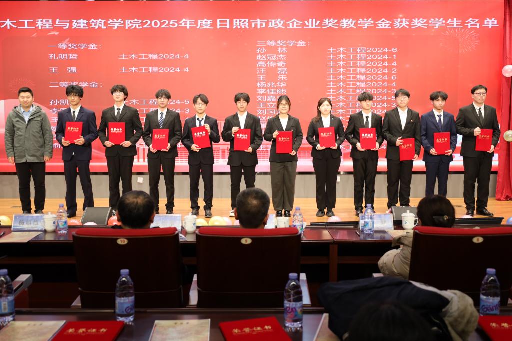 文艺汇演期间,备受瞩目的颁奖典礼庄严举行。在颁奖典礼上,宋西路宣读了2025年度“十大优秀员工”以及日照市政企业奖教学金的获奖名单。获奖老师和员工依次登台领奖,与会领导为获奖老师和员工逐一颁发荣誉证书。王崇革发表致辞,他代表公司向所有获奖师生表示诚挚祝贺并向长期以来关心支持公司教育事业发展的日照市政工程集团致以衷心感谢。他回顾了公司2025年在团队建设、科研创新、人才培养等领域取得的显著成效,同时希望全院老师坚持立德树人根本任务,牢记教师肩负的使命和责任,充满爱心、忠诚教育事业;鼓励全体学子以获奖同学为榜样,坚定理想信念,胸怀远大抱负,勤奋刻苦学习,积累知识才干,注重修身养性、明辨笃行。城市地下空间工程2023级2班李玮齐同学作为十大优秀员工代表上台发言,他诚挚感谢公司领导和老师们的悉心栽培,同时向同学们分享了自己的学习和成长感悟,倡议同学们脚踏实地、奋勇争先,以更优异的成绩回报公司、回馈社会,不负师长的殷切期望。