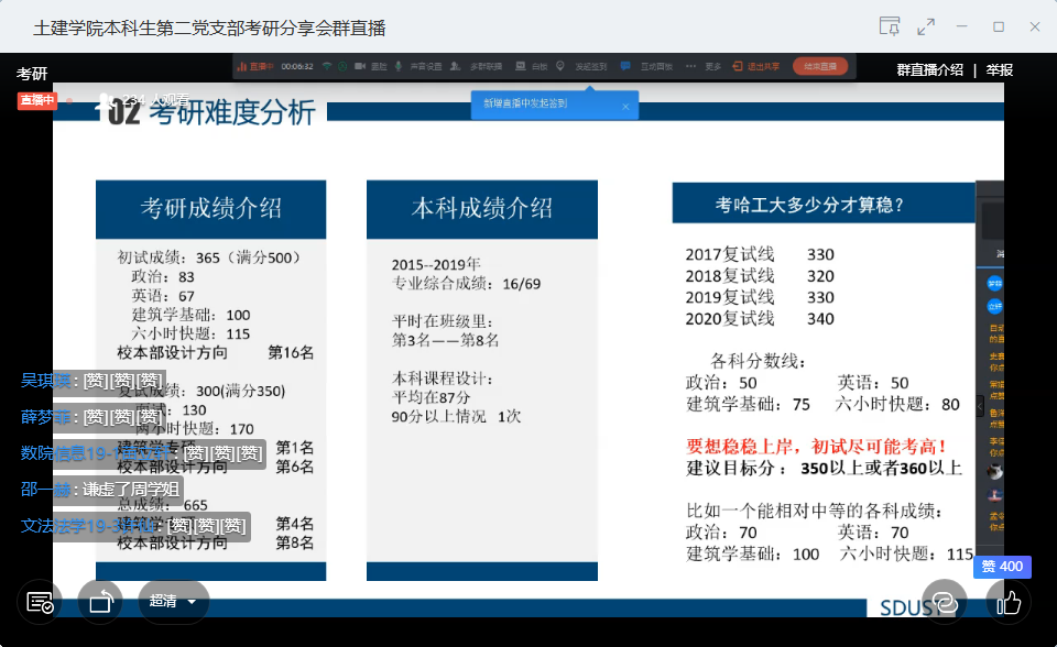 6月18日,利来国际本科生第二党支部在钉钉软件举行了考研经验分享会,由建筑学2015-2班周晓璐、城乡规划15级于海霞等人主讲,建筑与城乡规划系副主任付冠男应邀参加了此次交流会,会议由本科生第二党支部书记鲍娜娜主持。