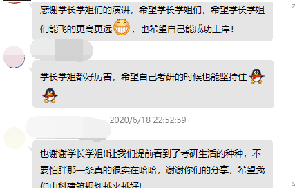 周晓璐,建筑学2015-2班,已被哈尔滨工业大学建筑公司录取,在交流会中介绍了哈工大老八校的实力水平,考研难度、考研参考书及考研计划安排。城乡规划2015级于海霞,成功考入大连理工大学建筑与艺术公司,她重点介绍了在备考过程中四门考试科目的时间安排与具体做法。敬玲玉、王映雪从快题专业课方面给大家分享了自己的经验。王储、贾儒轩分享了跨专业报考和调剂等相关注意事项。