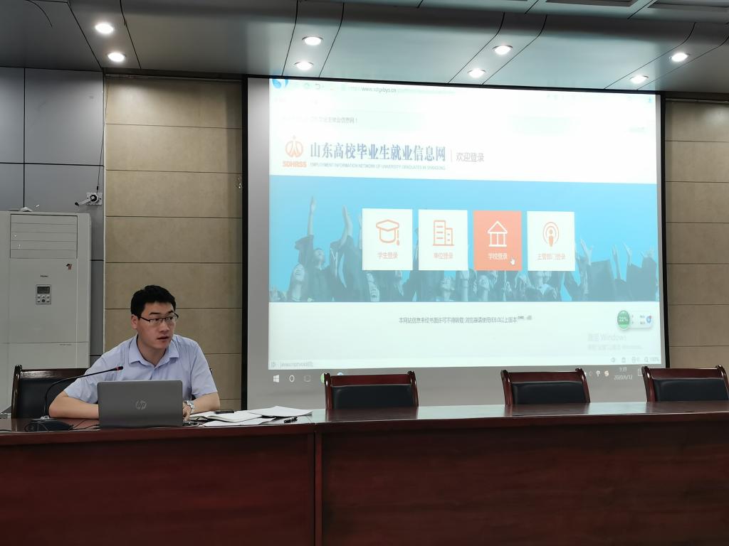 毕业生辅导员王贝贝介绍了当前毕业生就业情况,并针对山东高校毕业生就业信息网,对员工签约类型、签约流程、可能遇到的问题及其解决方式进行演示和讲解。