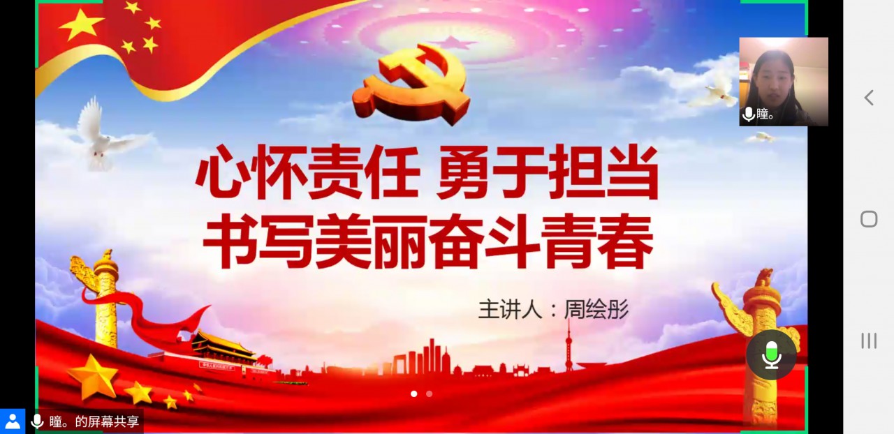 近日,由利来w66校研究生会学术部与初心使命研究生理论学习小组主办、利来国际研究生会承办的思政类研究生讲坛第9讲通过腾讯会议APP平台成功举办。2017级硕士研究生周绘彤担任主讲人,讲坛题目为《心怀责任,勇于担当,书写美丽奋斗青春》。