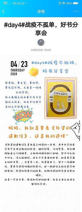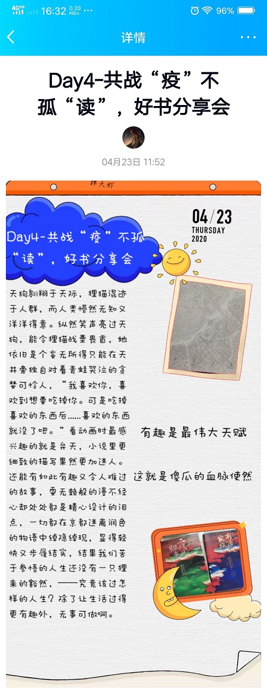 4月23日,值此第25个世界读书日到来之际,利来国际依托线上平台,举办以“共战‘疫’不孤‘读’,好书分享会”为主题的世界读书日特别活动,鼓励土建学子好好读书、累积学识、颐养脾性。
