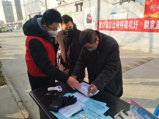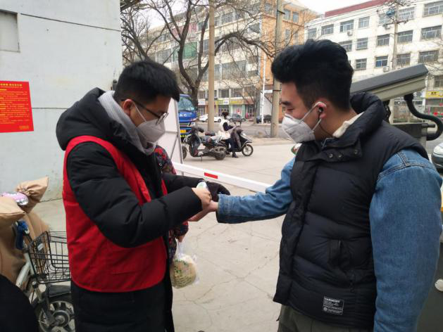 在山东省滨州市滨城区市中街道市南社区,2018级研究生周臣像往常一样在社区服务岗进行志愿服务,使用红外线体温测量计为进入社区的居民测量体温便是他的工作之一。