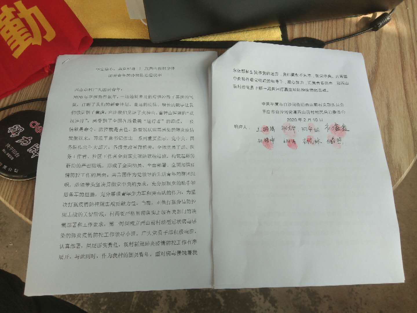 村口道路执勤的值班制度是轮班制。在不需要到执勤的时间里,初安妮和其他老员工志愿者一起主动承担了新冠肺炎的知识普及工作。他们向村民们科普新冠肺炎相关知识,为大家讲解口罩的重要性和正确佩戴方式,提醒路上没戴口罩的村民回家戴好口罩……她还在《坚定信心,共克时艰——致西山前村全体团员青年的疫情防控倡议书》上签下自己的名字。