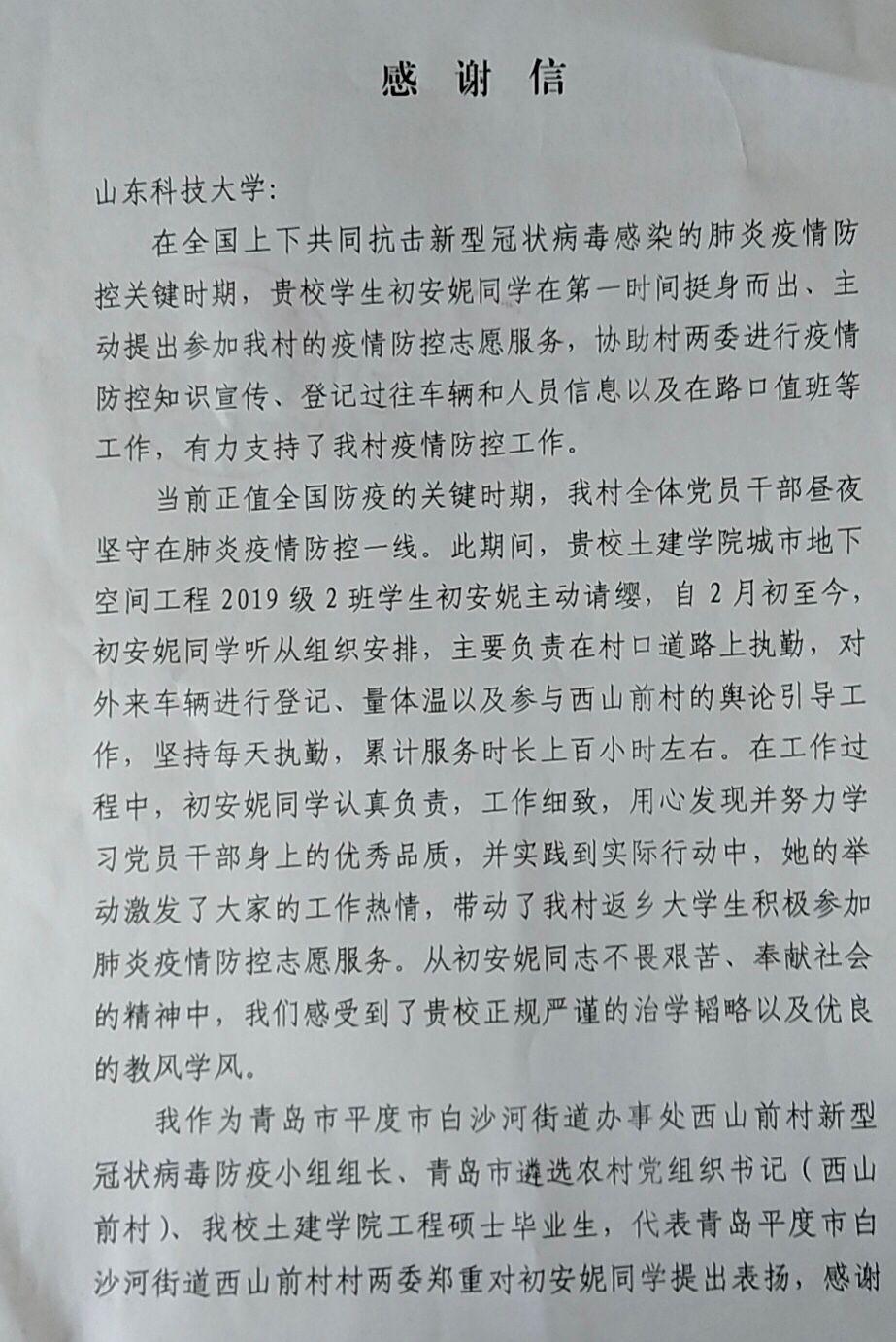 近日,利来国际收到中共平度市白沙河街道西山前村支部委员会的感谢信,了解到在全国上下共同抗击新冠肺炎疫情的时候,公司城市地下空间工程2019级2班员工初安妮也主动站到了抗“疫”前线,在青岛平度市白沙河街道办事处西山前村提供疫情防控志愿服务。