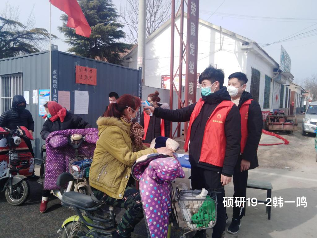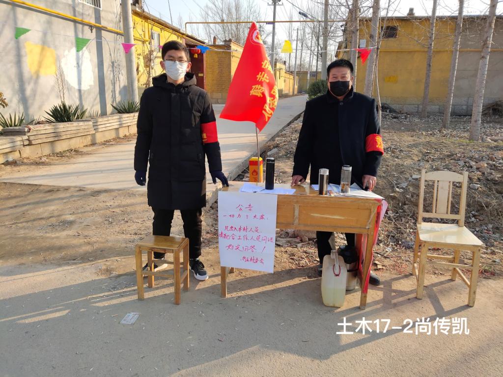 疫情就是命令,防控就是责任。24名土建学子戴上口罩,走出家门,走进社区,听从社区党团组织安排,科学有序参与到当地抗疫阻击行动中。其中,有党员2人,预备党员6人,入党积极分子9人。他们用行动来述说:防疫战斗在哪里,党员就在哪里,要让党旗在战“疫”一线高高飘扬。硕研18-1班周臣的主要工作是协助社区基层人员进行辖区内的排查摸访、政策宣讲、日常消杀、体温测量和交通管制工作。“在岗几天里,防控指挥部一共发布六次通知,警方先后发出五次通告,指挥部的通知书是红色的,警方通告是蓝色的,通知一次比一次紧,一次比一次急。每次通知通告都要第一时间告知居民,不到几日,小区门口的墙上已经满是红红蓝蓝的颜色。”正是这红红蓝蓝的颜色让他越发积极的参与到社区防疫工作中,越发认清了党员的责任与使命,越发坚定了党员的信仰。土木16-2班胡倩和土木17-2班尚传凯在村里志愿服务的事迹被当地媒体采访报道。