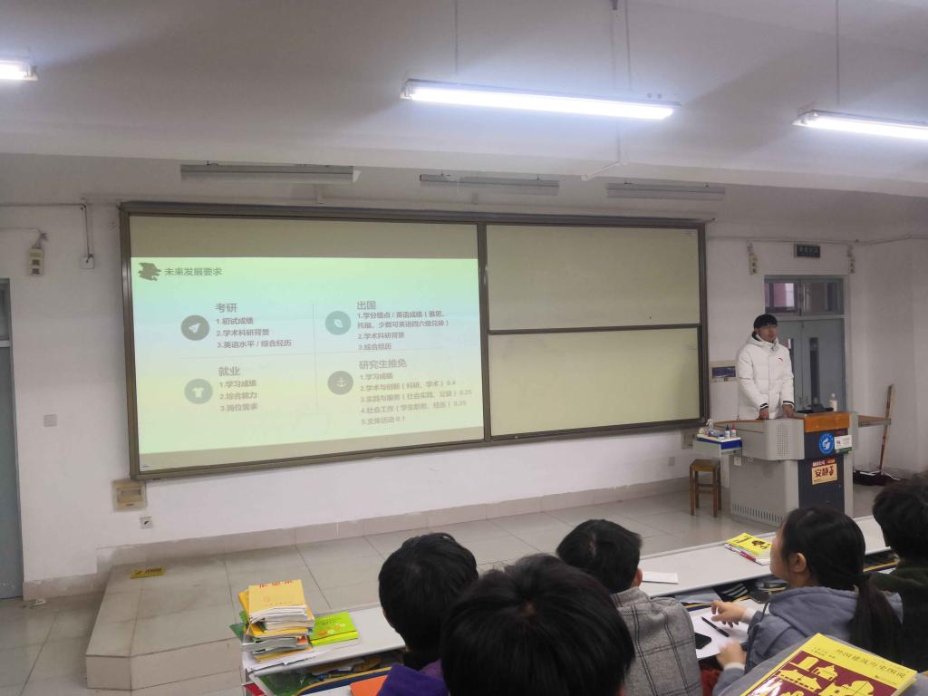 韩英卓,建筑学2015-1班,现已被推免至天津大学建筑公司攻读硕士研究生。他先是以课程学业为基础,从日常生活“怎么做”与工作面试“怎么用”两方面,再次强调了学习成绩的重要性。结合着员工工作的经历与感悟,提出班级干部要互相协作,班级同学互帮互助,强调共赢的重要性。刘珂,城乡规划2015级,现已被推免至湖南大学建筑公司城市规划专业攻读硕士研究生。他结合自身经历,介绍了学术与创新、实践与服务、文体活动三个方面的经验与方法,以及学术科研背景在保研、考研、出国等方面的重要性和意义。