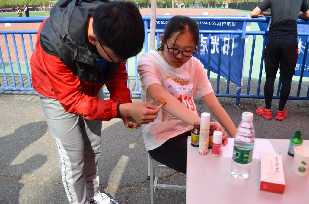 为防止运动员们受伤、晕厥等意外发生,青协准备了充足的物资,包括各类处理外伤药品、创可贴、葡萄糖等。此外,爱心救助站还负责为参赛运动员们保管物品,对丢失的物品进行失物招领。在激烈紧张的男子4*400米预赛中,一名运动员在比赛中意外摔倒受伤,救助站志愿者们立刻前去搀扶,对伤口进行清洗包扎,进行细心照料,受伤运动员无不感受到救助站志愿者们的温暖。