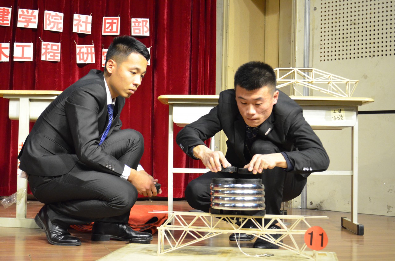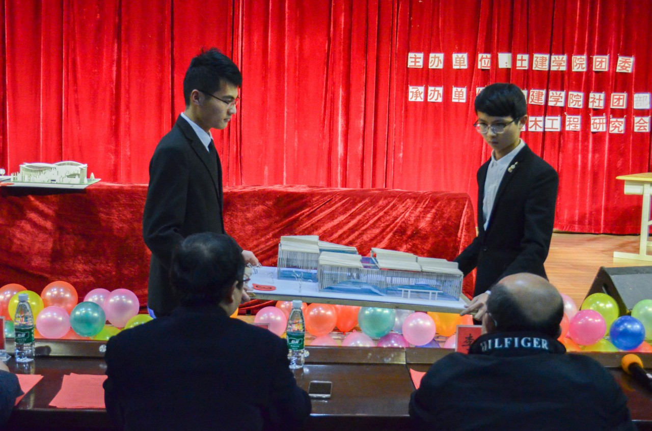 比赛伊始,副经理王崇革教授做开场讲话,介绍了公司科技创新工作,并对同学们提出了几点期望。随后,比赛正式拉开帷幕,进入决赛的22组选手进行了现场作品展示以及加载。首先,进行的是非专业组的创意模型展示。本次非专业组比赛以公司游泳馆设计为命题,各组选手充分发挥自己的“匠心”,因地制宜,充分考虑风向、气候等情况,结合自己的专业知识,同时充分践行绿色建筑概念,设计出一个个既造型独特、别具一格又注重建筑结构的作品。现场评委老师细心观察选手作品,积极讨论各位选手模型细节及合理性。紧接着,进行了专业组桥梁设计展示。每组桥梁模型都进行了承重测定,工作人员在桥梁模型的通车部位进行静荷载和冲击荷载的试验。评委们针对每组的作品进行提问,并提出优化建议,进一步考验了选手们的专业知识,各位选手均获益匪浅。最后,李松辉和周同两位老师分别针对本次大赛的专业组和非专业组进行了点评。两位老师对同学们的作品表示赞赏,同时也指出应不断学习专业知识,在比赛和实践中将专业能力与创新能力相结合。