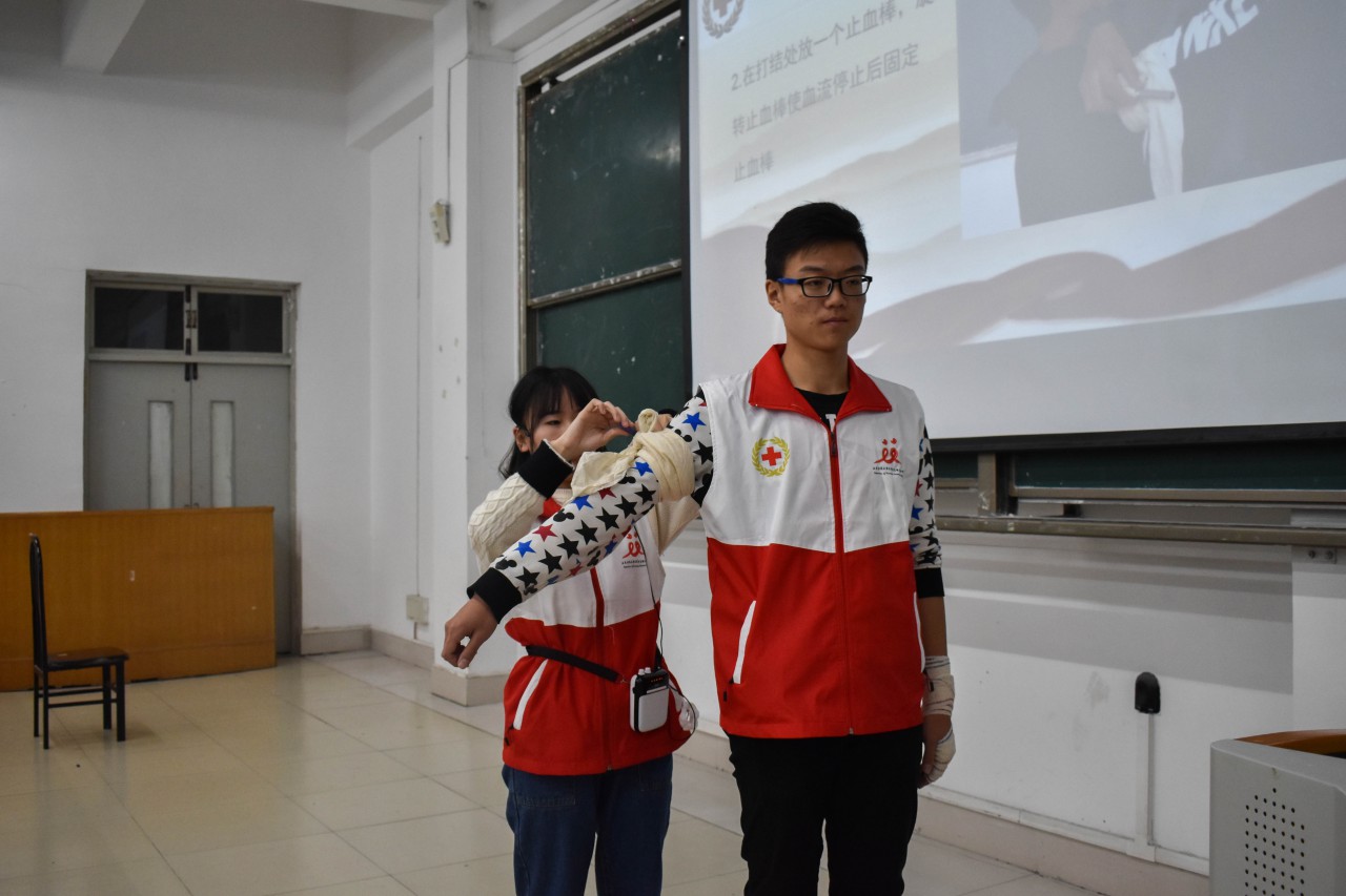 培训会伊始,志愿者便开始对包括骨折、出血等各种常见伤情进行讲解和包扎演示。随后,志愿者又演示了头部受伤、大小臂骨折等的包扎固定方法。为提高在场同学们应急包扎方法的熟练度,现场志愿者们提供纱布等急救用品让员工进行练习。同时校志愿者联合会的志愿者们在场下进行热心帮助,对同学们包扎过程中存在的问题进行耐心解答。培训会最后,志愿者们演示了心肺复苏的全过程。现场两名同学在讲解员的指导下成功演示了心肺复苏。讲解员强调,心肺复苏是一项十分消耗体力的救助方式,如果同学们在实际生活中遇到此类求助人员,应至少两人轮换对该人员进行心肺复苏。讲解员仔细讲解,同学们认真听讲,在讲解员仔细的讲解和志愿者们的帮助下,积极参与练习,收获颇丰。