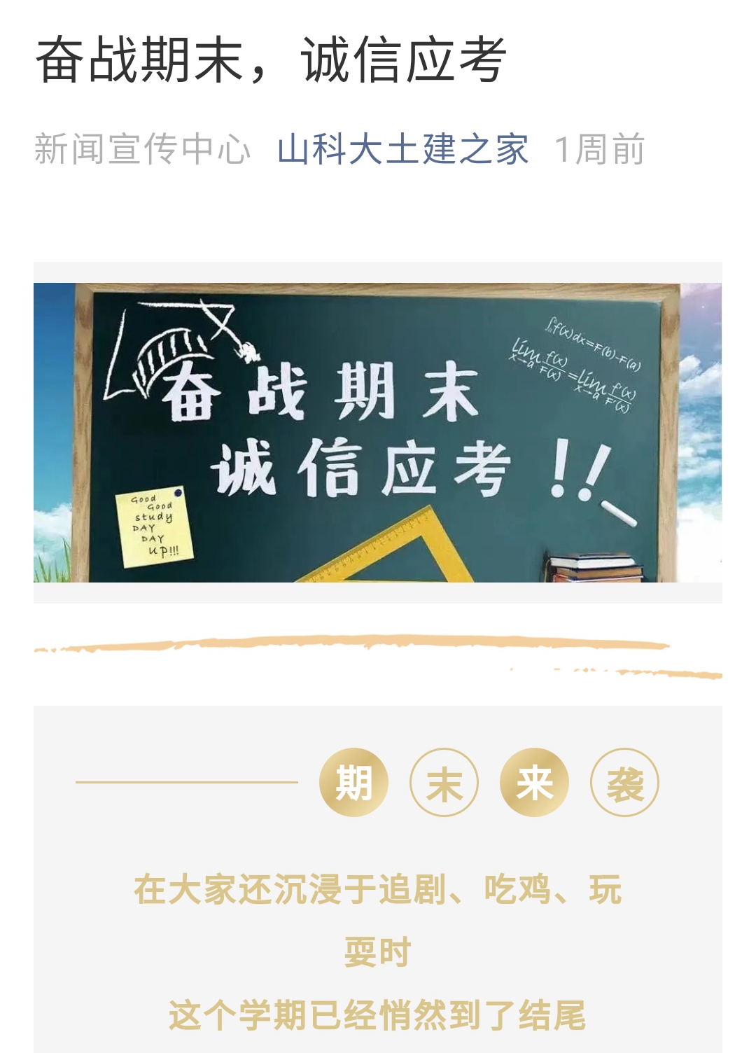 公司对近4年员工考试违纪处分情况进行通报,在“山科大土建之家”微信公众号、“土建易班”平台累计发布宣传教育推文近10篇,于宿舍楼下张贴“诚信应考”海报,营造良好氛围。