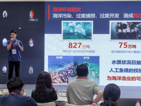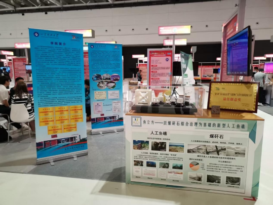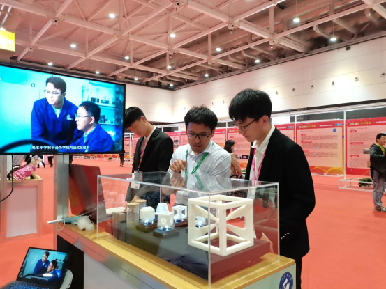 “鱼立方”项目团队成员在项目展区向前来参观的观众介绍项目内容,展示人工鱼礁3D打印模型和材料样本,细致全面地讲解“鱼立方”项目的出发点和创新点。在展示项目成果的同时,成员们积极与其他高校参展员工交流互动,彼此学习分享创新创业经验。