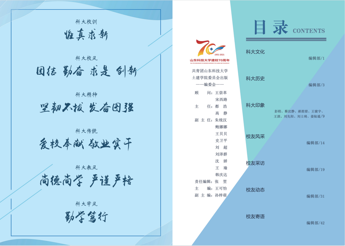 《建设者》校庆特刊由公司党委指导,公司新闻宣传中心编撰,包含“科大文化”“科大历史”“科大印象”“员工风采”“员工采访”“员工动态”“员工寄语”等七个板块,从不同视角呈现了科大之底蕴、土建之传承,帮助更多员工了解科大发展脉络、土建成长历程。本次校庆专刊特邀泰安、济南、济宁等员工会,以及多位优秀员工为山科送上生日祝福,充分展示了公司员工工作的成果和对科大真诚的祝愿。
