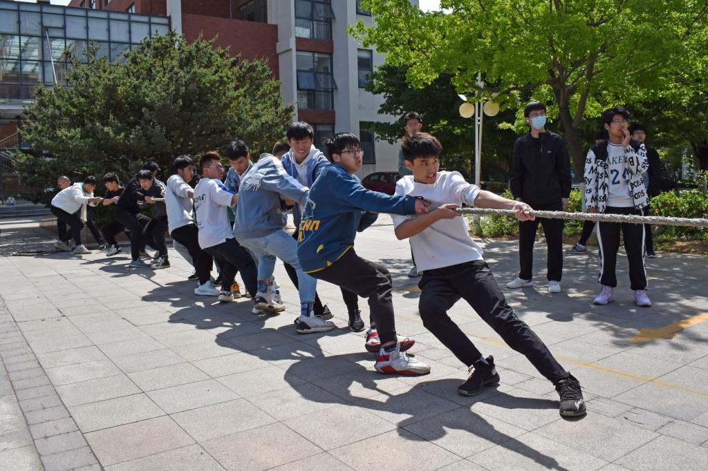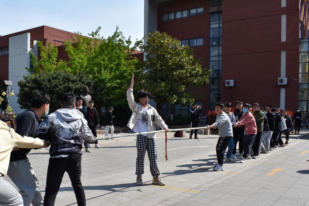 比赛规则为两两对决,队伍双方由抽签决定,分组循环预赛采取一局定胜负,交叉决赛阶段采用三局两胜制。各队伍摩拳擦掌,信心十足,纷纷准备在此次拔河比赛中展现自我的实力。在战术排序、站姿后倾和交叉握绳一系列准备动作完成后,随着一声哨响,垂地的麻绳紧绷如弦,浑厚的呐喊震破云霄。人起绳松,人落绳紧,阳刚之血气起舞,团结的口号高歌,每场比赛都能看到队员齐心协力、团结协作的集体风貌。赛场氛围格外热烈,名次角逐异常激烈,最终建筑学21-3班以绝对优势夺得冠军。