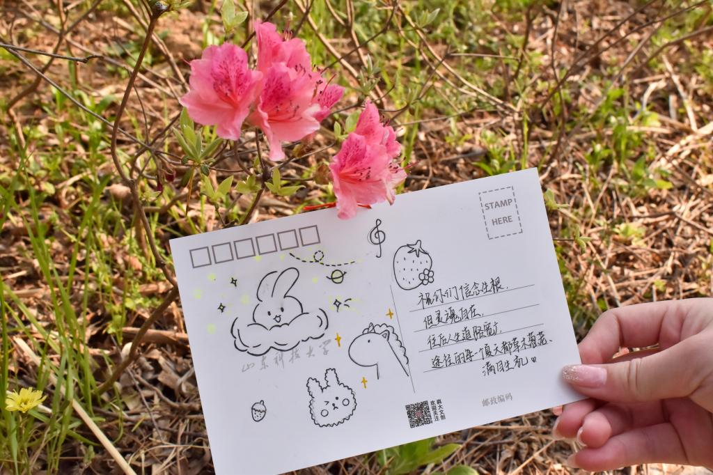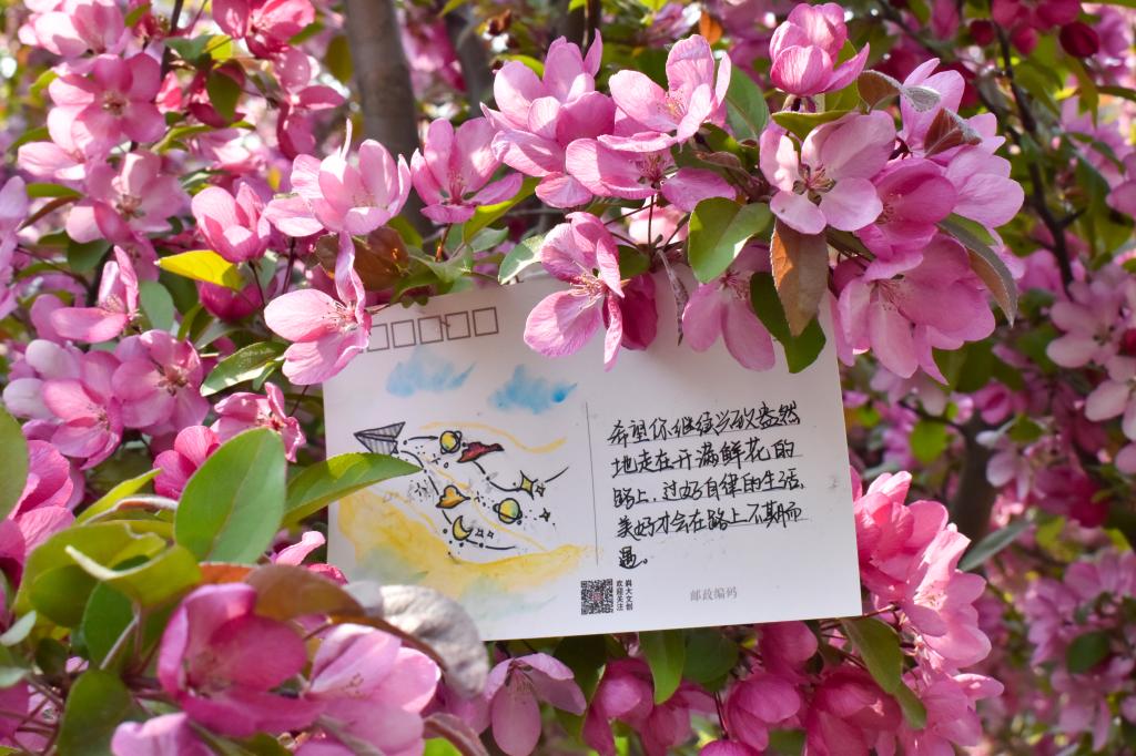 活动中,参与的员工寄情于笔,或书写出自己对毕业生深深的祝福,或描绘出一幅幅色彩斑斓的画作,用自己的真情实意填满整张明信片。随后,同学们将充满依依惜别之意的明信片放置在校园美景中,将祝福遍布整个校园。同学们漫步于墨水河畔,行走于若水园中;于励志坊边走过,在晨读园中徘徊。“挥挥手,作别青春的校园,留下灿烂的笑容,祝你万事胜意”“愿前程似锦,祝未来可期”……这些真挚的祝福语无不承载着同学们的心意。明信片悬挂于万紫千红之间,与满园美景一起,为毕业生送出真挚的祝福。