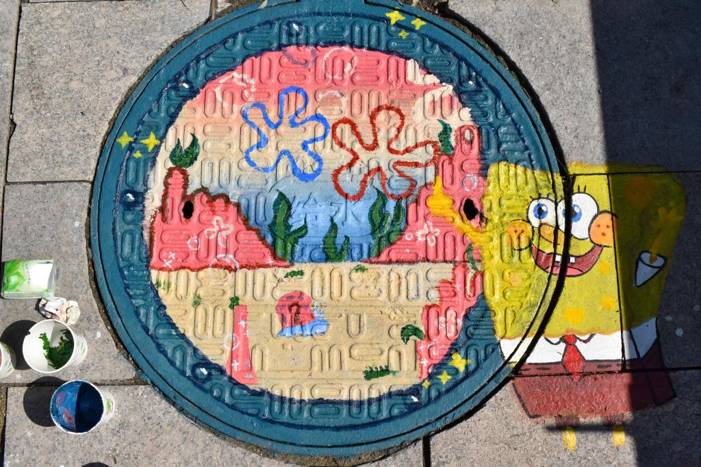 活动伊始,同学们热情高涨,每个小组提前做好准备工作:构思作画图案、清洁井盖和调颜料。清理、调色、打形、上色,配合默契,有条不紊,每一步都必不可少,画出的每一笔都充分展示了土建学子的实力,留下的每一抹颜色都演绎出属于土建学子的精彩。在各个小组的不懈努力下,一幅幅精妙绝伦的作品逐渐呈现在我们的面前:有妙趣横生的海绵宝宝,生动可爱,栩栩如生;有充分展示爱国爱党的情怀,不忘初心,牢记使命,喜迎二十大……原本“灰头士脸”的井盖在同学们的妙笔下变得充满生机与活力。