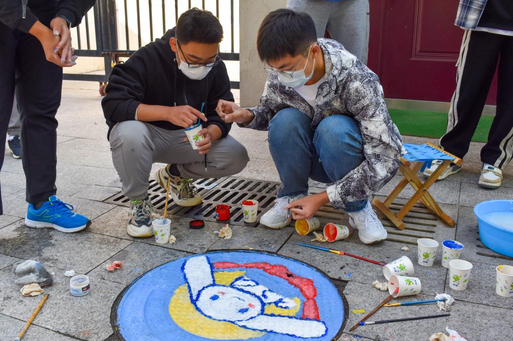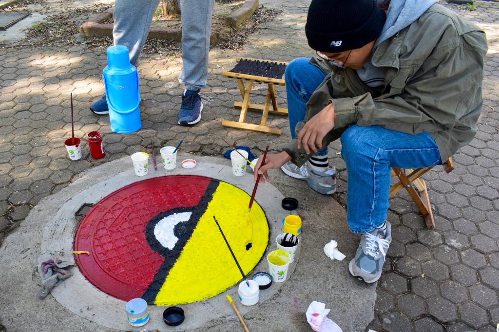 活动期间,漫步在校园内,随处可见员工们三人一伙、五人一群蹲坐在井盖旁,或勾线或上色,用一笔笔浓墨重彩的颜料让井盖换装变“景盖”,为校园“井”上添花。活动吸引了过往师生驻足拍照,这特色鲜明的井盖也已然成为校园的一道靓丽的风景线。