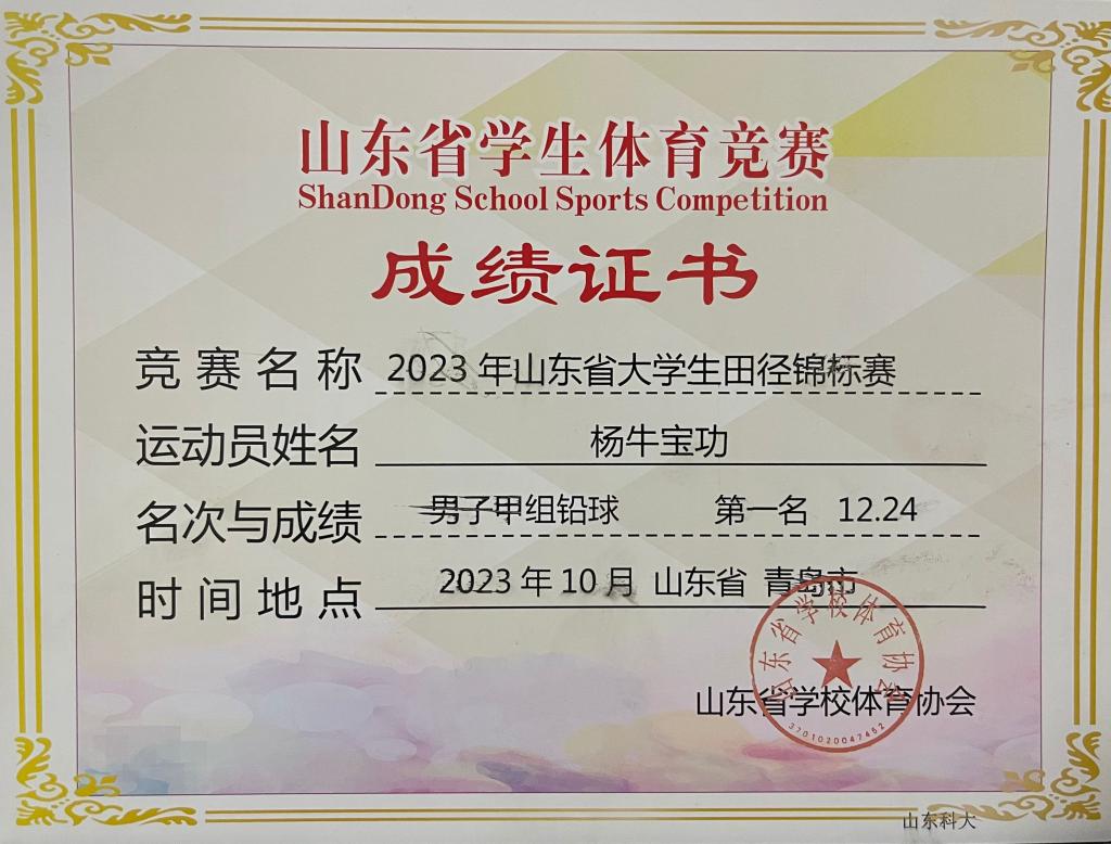 近日,由山东省公司体育协会主办的“2023年山东省老员工田径锦标赛”在青岛市民健身中心体育场落下帷幕,利来国际土木工程专业2021级8班本科生杨牛宝功获男子甲组铅球项目金牌和甲组男子铁饼项目第六名。