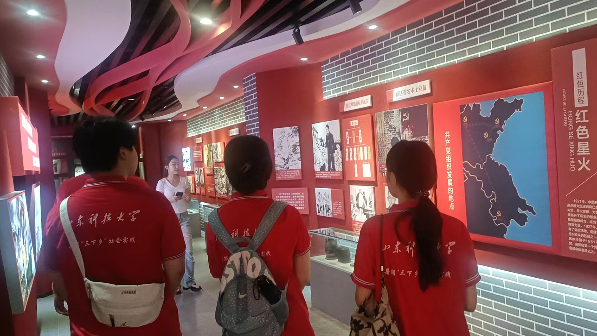 7月24日,团队成员来到青岛市杨家山里红色教育基地。“感受弦歌不辍的传承,激荡思接千载的心绪”,红色文化需要传承也必须传承,团队成员在参观时恰与假期研学的小员工相遇,看着他们认真聆听着讲解员讲述杨家山里人民在中国共产党的领导下,与日伪浴血奋战的故事。此刻展板上的那句“红色基因代代传承”成为现实。团队成员还和小朋友们一起瞻仰了革命先辈们抗日武装斗争的珍贵历史照片、实物,观看了杨家山里人民英勇抗争的历史影像和杨家山里乡村振兴的发展历程。展馆中,1937年至1945年间党在杨家山里斗争的点点滴滴被生动地展现出来,让每一位团队成员都深受感动。