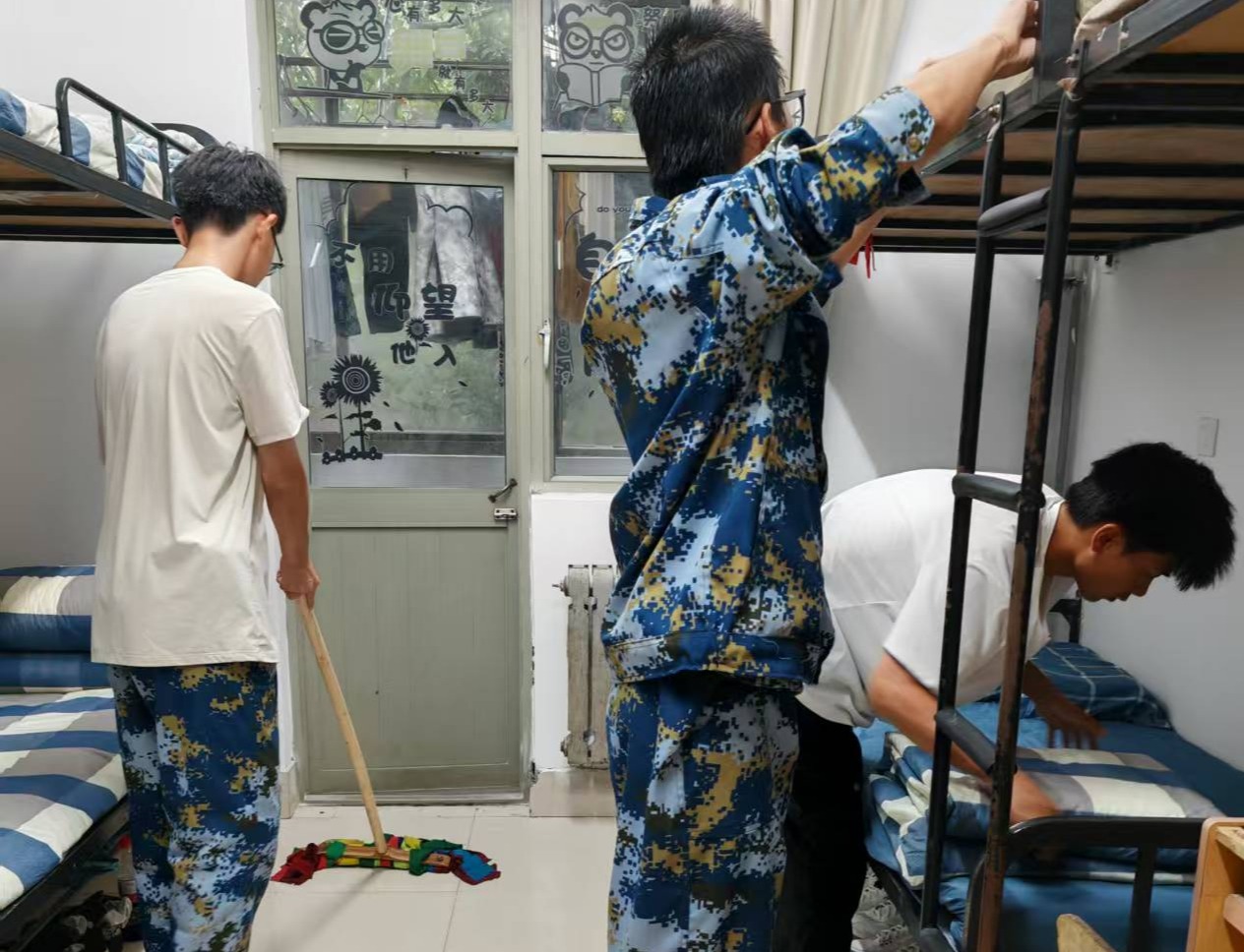 宿舍里,身着整齐军训服的同学们,认真投入学习。在教官的示范指导下,大家专注地投入到内务整理中。叠军被,要将被子抻平、压实,折出规整的棱角,力求如“豆腐块”般方方正正;整理个人物品,需按照类别有序摆放,让桌面、衣柜整洁有序。从被子的边角到物品的摆放,每一个环节,同学们都细致对待,反复调整。虽然没有了训练场的烈日与口号,但大家眼神专注、态度认真,尽显土建学子的精神风貌。