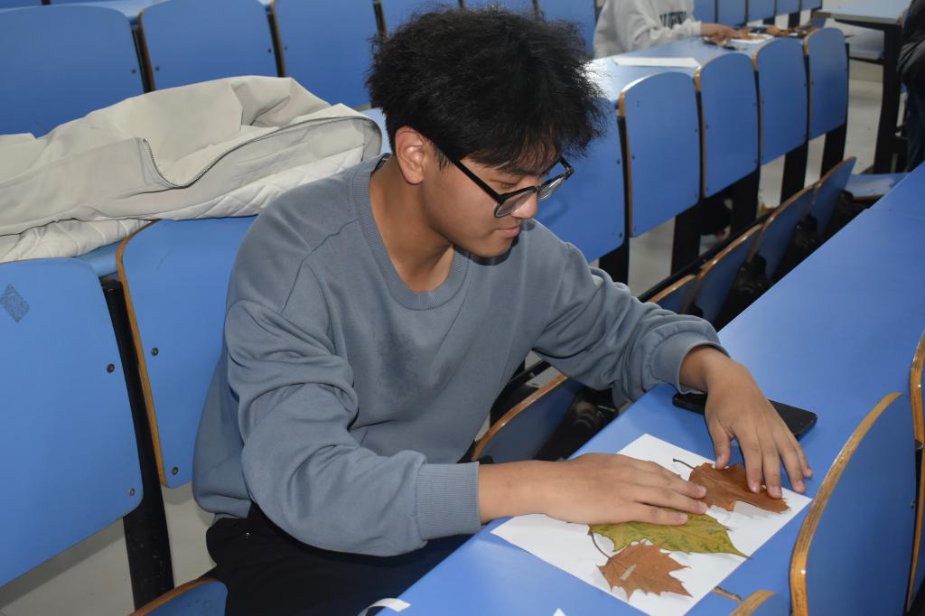 活动现场,同学们从自备的材料袋中精心挑选形态、色彩各异的树叶,以自然素材为创作基础开启艺术构思。在两个小时的沉浸式制作中,一件件独具特色的叶贴作品相继完成,一片片原本普通的落叶,在同学们的巧思与巧手雕琢下被赋予新的生命力,生动诠释出秋日的浪漫意蕴与手工艺术的独特魅力。活动尾声,所有参赛作品在专属展板上完成集中陈列,同学们相互交流创作心得,现场氛围热烈融洽。