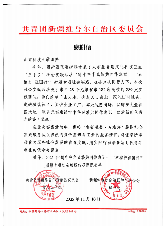 在感谢信中,共青团新疆区委对实践队给予了高度评价,认为他们“将课堂所学转化为服务社会发展的青春实践,用实际行动彰显了新时代青年员工的使命与担当”。