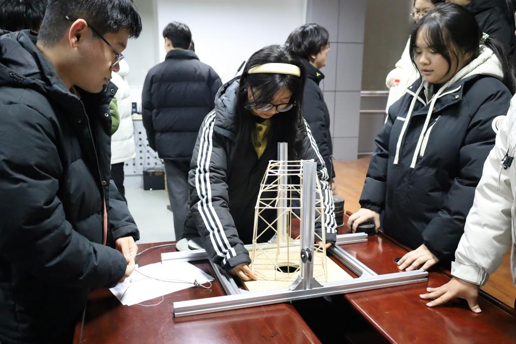 初赛重点进行B组结构模型的展示与讲解环节。该组别对模型材料与结构提出了明确要求:作品须以木条为主要材料,通过胶水粘接固定,不得使用其他辅助材料;模型主体由正四棱台与长方体嵌套构成,且长方体必须完全置于正四棱台内部。各参赛团队依次上台,从设计理念、结构特点、制作工艺等方面对作品进行了详细阐述,并现场完成了承重测试。