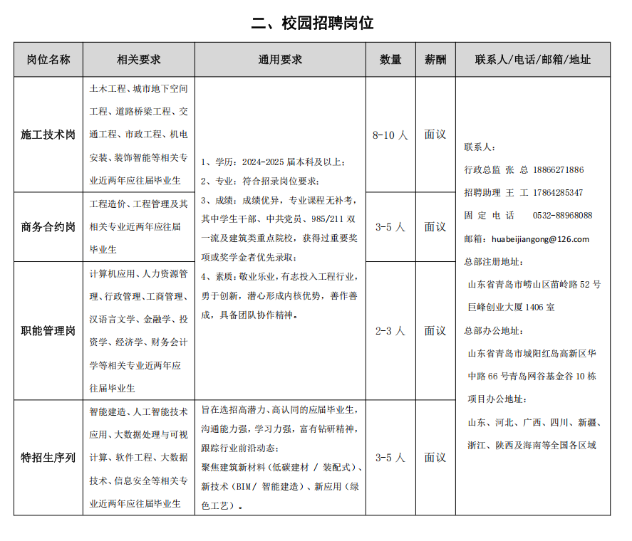 华北建工工程集团有限公司,创立于 2014 年 8 月,注册地址位于山东省青岛市,公司经济实力雄厚,注册资本 50000 万元,净资产达 30000 万元。公司下辖各区域分公司、区域办事处等若干分支机构,承建工程涵盖施工总承包、EPC、专业承包、劳务分包等多种施工模式,是以市政、房建为主,集公路、水利水电、钢结构、装饰装修、消防设施、电子与智能化、防水防腐与保温、地基基础、压力管道等建设工程施工、工程管理服务及新材料新技术研发等于一体的综合性总包施工企业,企业通过质量、环境、职业健康安全综合管理体系认证,是国家高新技术企业认定单位,为国家 AAA 级信用等级企业、山东省市政工程先进施工企业。公司现拥有一批素质高、专业精、能力强的各专业技术人才和管理人员,员工总数达三百余人,拥有大中型机械设备 100 余台套,年累施工产值超 10 亿元,可承揽国内外大体量、大规模、高标准、高层次的建设工程施工任务。公司自成立以来,经过多年的拼搏和发展,业务范围逐渐拓展至全国各地,施工足迹遍及山东、河北、黑龙江、广西、广东、内蒙、四川、新疆等地市区,工程质量合格率 100%,优良率达 95%以上,多次受到各级建设主管部门及业主单位的表彰。