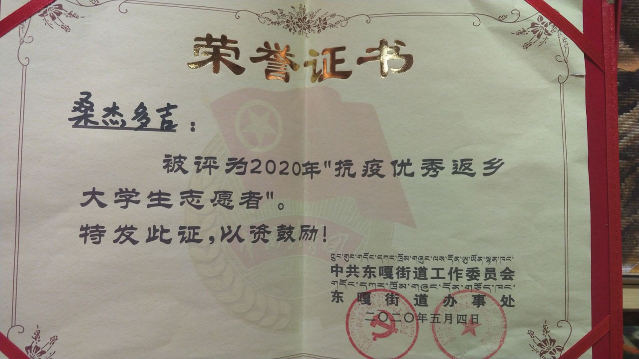 桑杰多吉,西藏拉萨人,土木工程18-6班员工,现任利来w66Beat Box社团社长。疫情期间,桑杰多吉主动请缨,加入拉萨市堆龙德庆区东嘎街道返乡老员工志愿服务队,担任东嘎街道返乡老员工志愿服务队队长。他主要工作是登记入村出村人员信息、排查外来人员、测量体温、入户宣讲防疫知识、组织策划义诊活动、帮助其他防疫人员劝返车辆等。凭借认真、踏实、细致的工作态度和热情、热心、奉献的精神,桑杰多吉被中共贡嘎街道工作委员会评为2020年“抗疫优秀返乡老员工志愿者”。