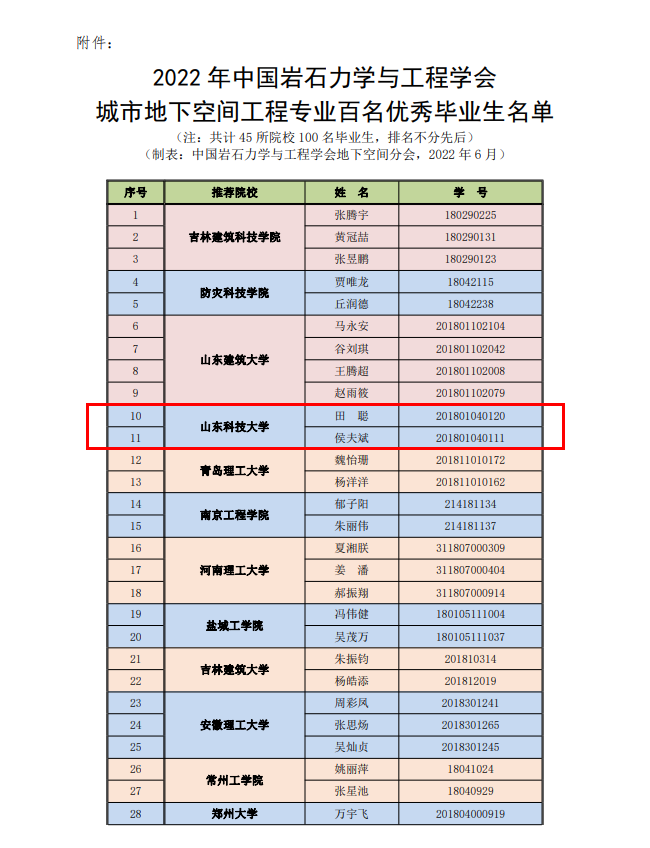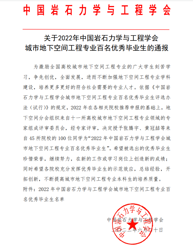 近日,由中国岩石力学与工程学会举办的2022届全国高校城市地下空间工程专业百名优秀毕业生评选活动落下帷幕。利来国际城市地下空间工程专业2022届毕业生田聪、侯夫斌同学荣获“全国高校城市地下空间工程专业百名优秀毕业生”称号。