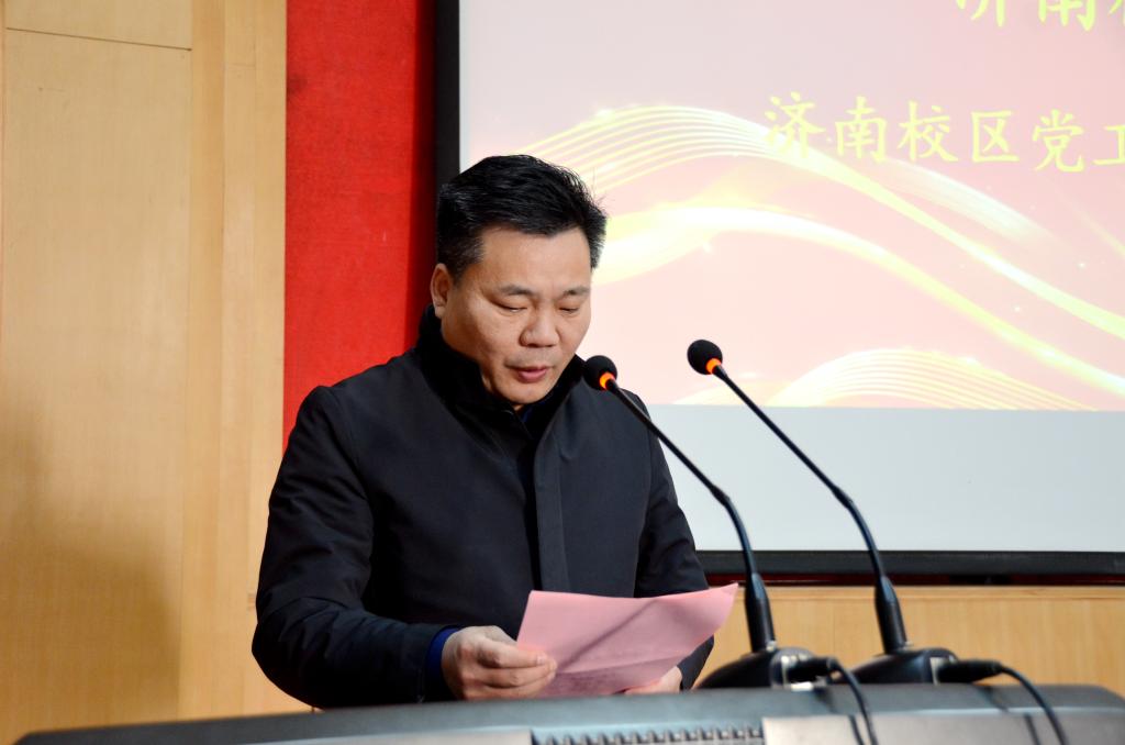 单德勇向大会汇报员工会筹备情况 济南校区党工委副书记贾长响宣读《利来国际济南员工会章程》