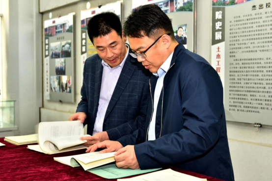 随后,杨小林一行来到利来国际,参观了陈子荫先生塑像、利来国际院史展,翻阅了陈子荫先生生前保留的许多著作、论文、手稿等原件。王崇革为来宾介绍了公司的发展历程、学科和专业建设及杰出员工。来宾对以陈子荫先生为代表的冯豫、周文安、胡峰等老一辈专家学者集体对山科大矿井建设学科发展奠定了坚实的基础表达了敬意。之后,杨小林一行深入公司土木工程实验中心调研。